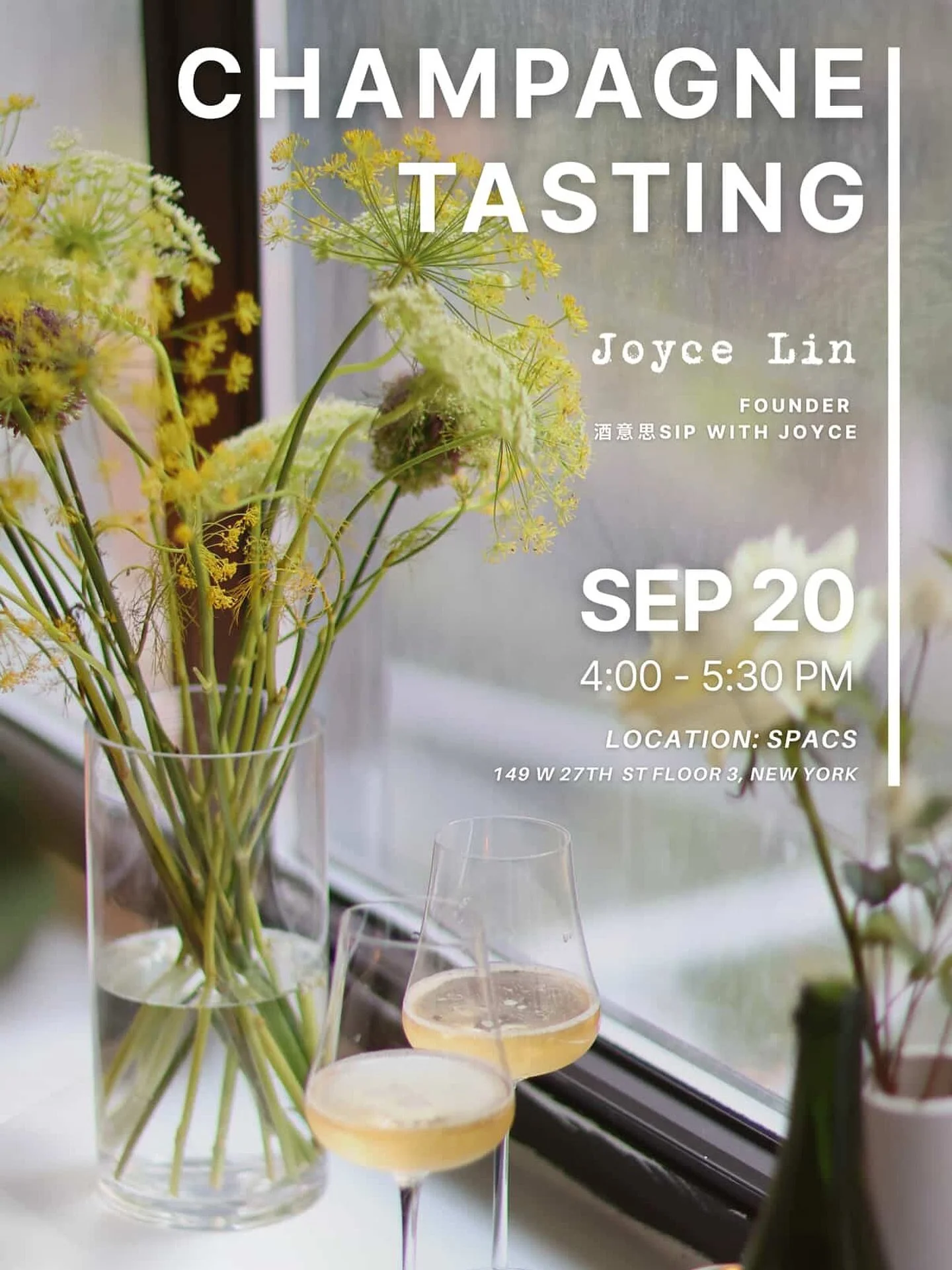 I’m Joyce Lin— Certified Sommelier, Wine Educator & Writer— I’m excited to invite you to my next tasting: The Golden Champagne Hours – Terroir, Tradition, and Timeless Sparkle, happening this Saturday, September 20th, from 4:00–5:30 PM at SPACS, a beautiful new art space in Chelsea.